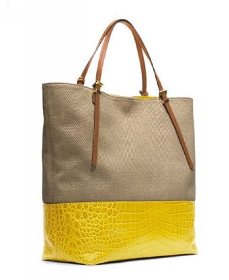 * Woven fabric with yellow crocodile-embossed leather bottom.
