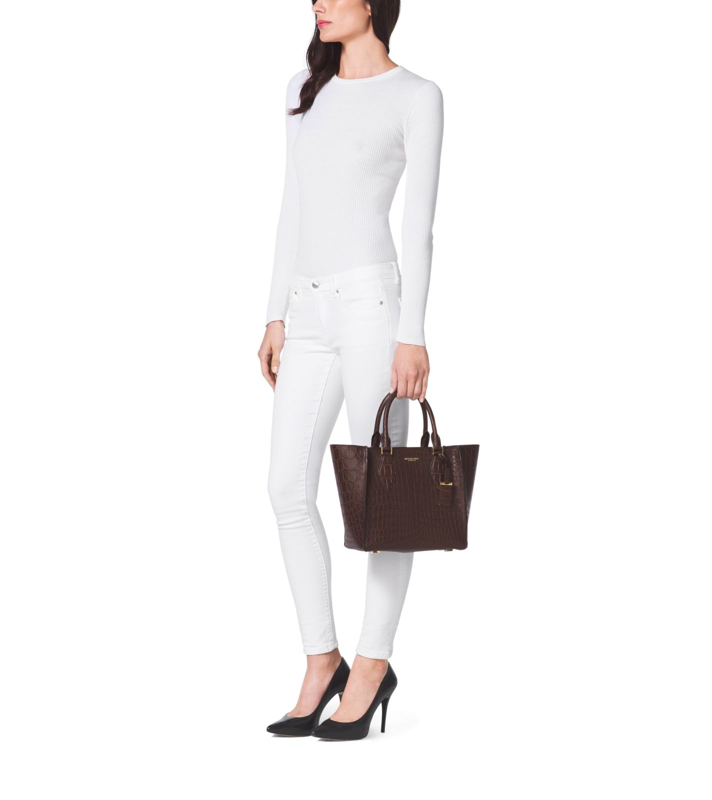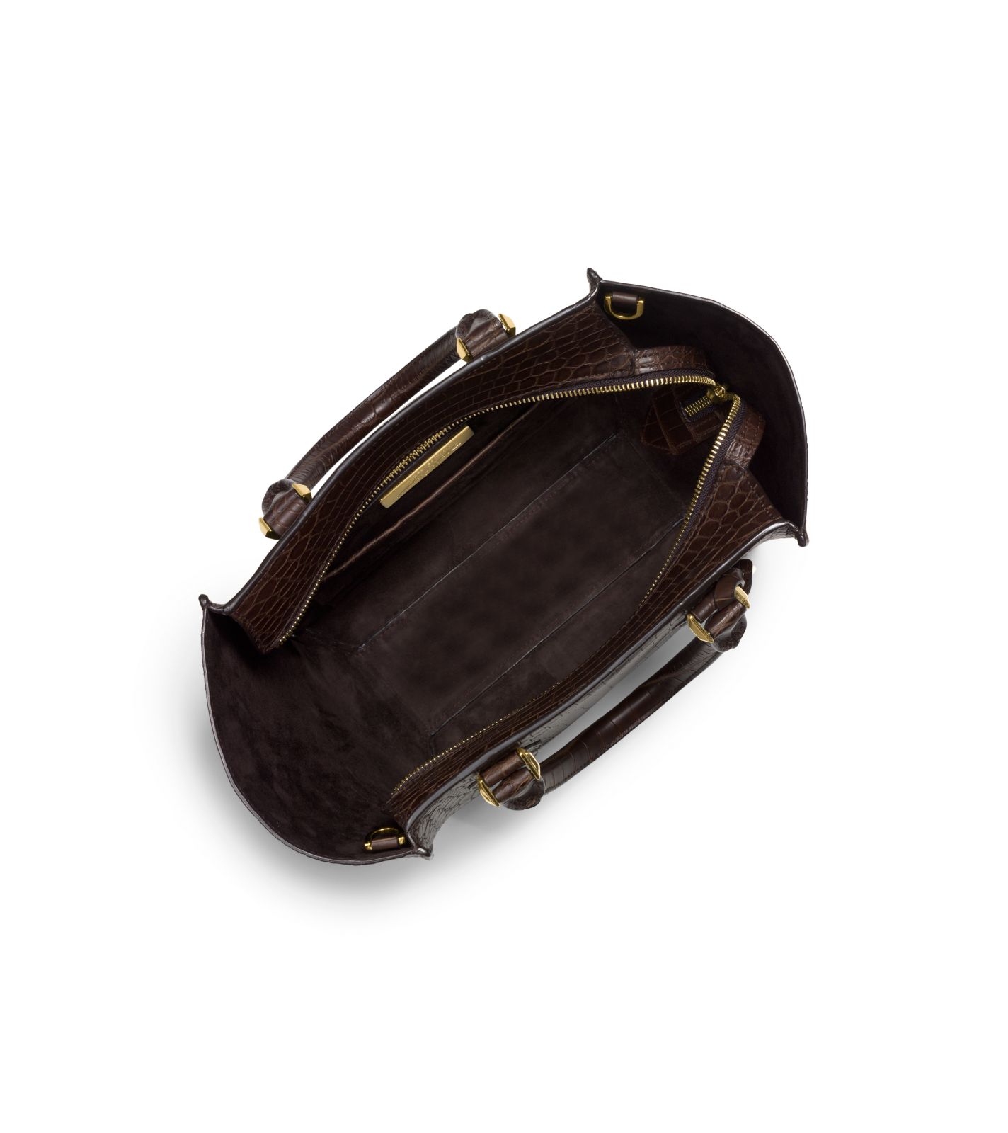 Impeccably crafted with clean lines in a razor-sharp construction, this deceptively roomy tote defines timeless sophistication. Its exotic, supple crocodile skin adds an element of luxury to this polished piece, while enriching the design with tactile texture. Let it play against streamlined, tailored ensembles—it’s the secret to instantly pulled-together élan on even your busiest days