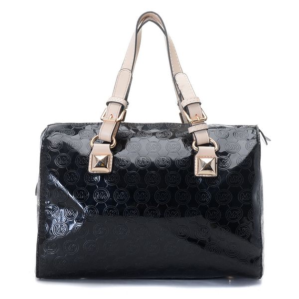 * Beige buckled leather top handles with rings and pyramid stud detail.