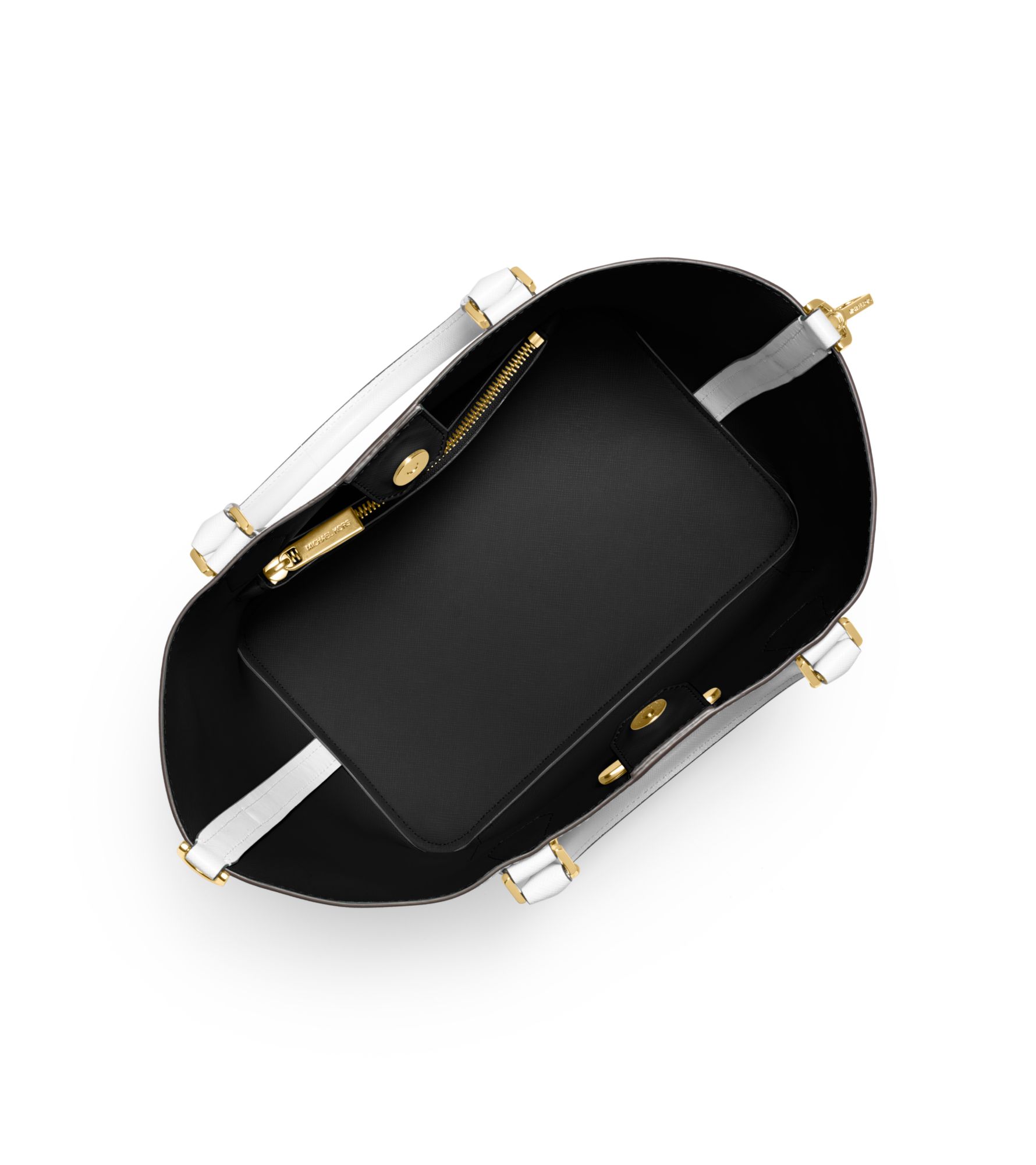 Exclusively Ours in the U.S. in Michael Kors stores and on michaelkors.com until 10/31/15. The season’s byword for glamorous and on-the-go? Our Greenwich handbag. Balancing a polished sensibility with a laid-back ease, this structured design features top handles, a removable shoulder strap and signature hardware, while a contrast-color interior offers chic juxtaposition. Carry it in the crook of your arm from commute to cocktails and everywhere in between.