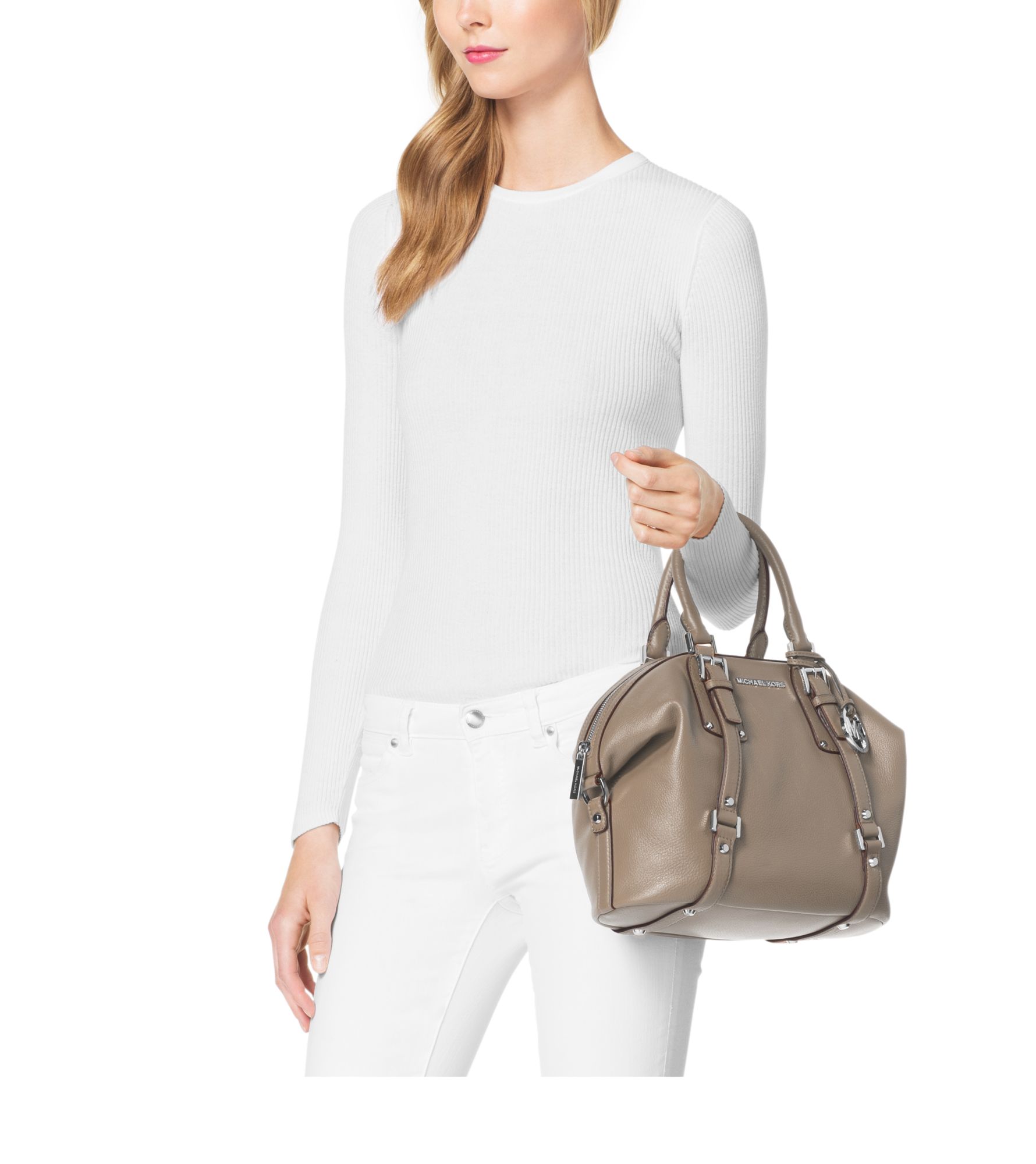 Exclusively Ours in the U.S. in Michael Kors stores and on michaelkors.com until 10/31/15. The Bedford satchel is the kind of classic piece that no handbag collection should be without. Its slightly slouched silhouette and soft leather make this design the epitome of understated elegance. Carry it by its top handles with tailored office ensembles or wear it by its shoulder strap for a laid-back look.