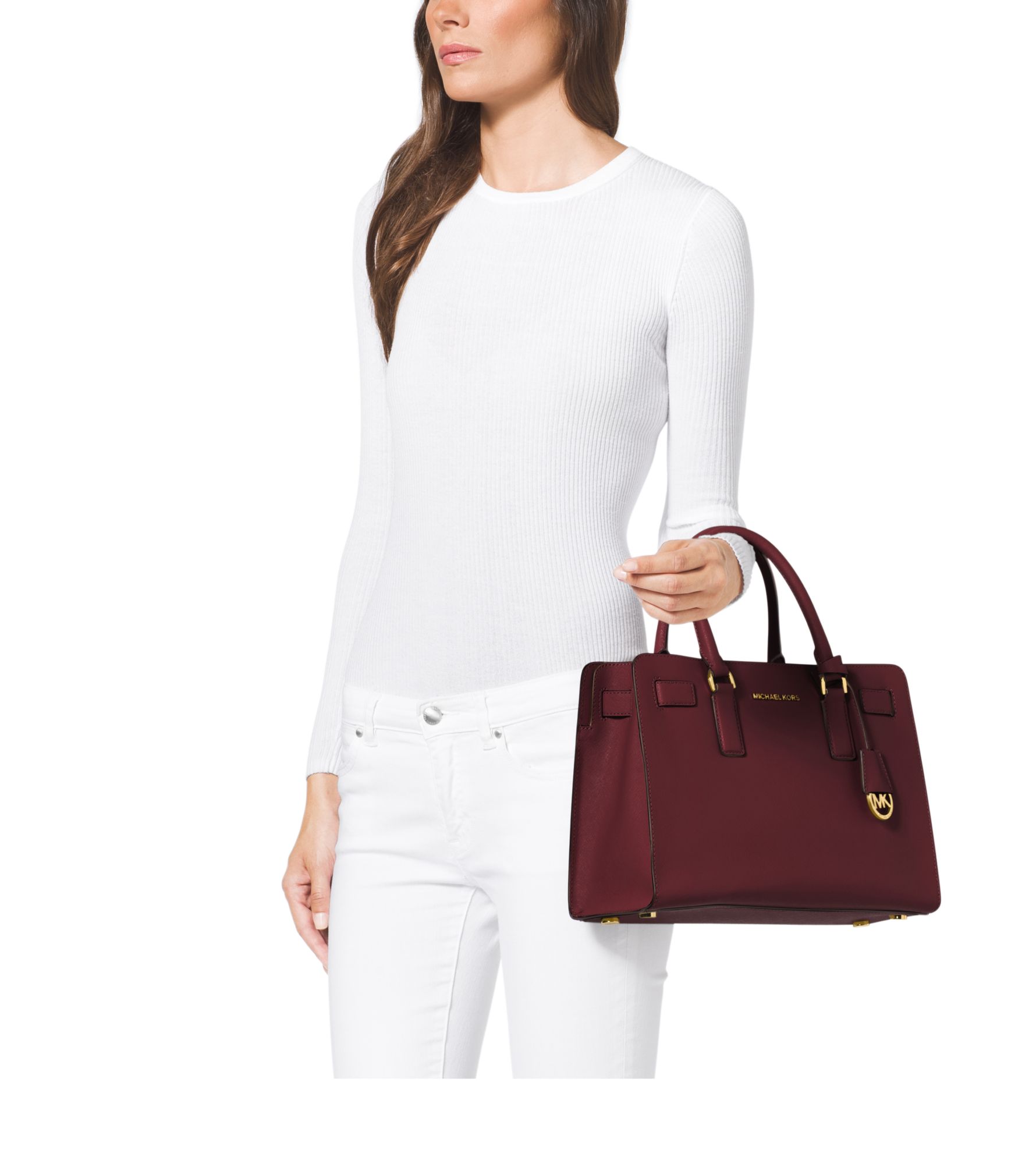 Walking the line between ladylike and luxe, our Dillon satchel showcases a structured silhouette cut from Saffiano leather. Its sharp lines provide instant poise to a wealth of outfit options, from tailored office separates to an off-duty cardigan and jeans.