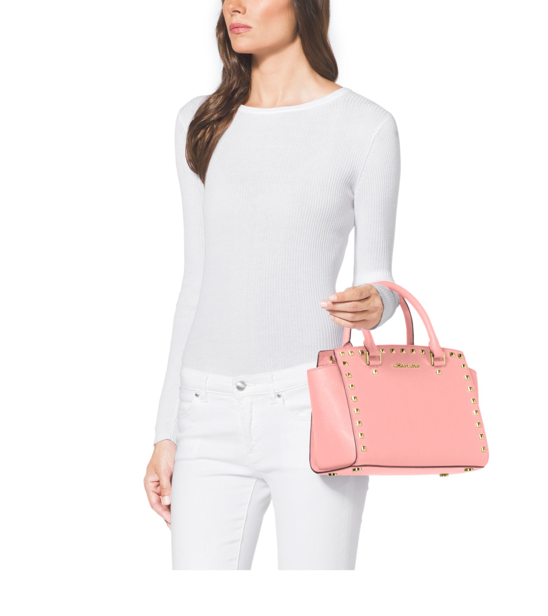Our Selma satchel makes a case for elegant embellishment. Trimmed with high-shine studs, our much-loved must-have has an edgy advantage, while the simple, structured shape promises a sensible statement season after season.
