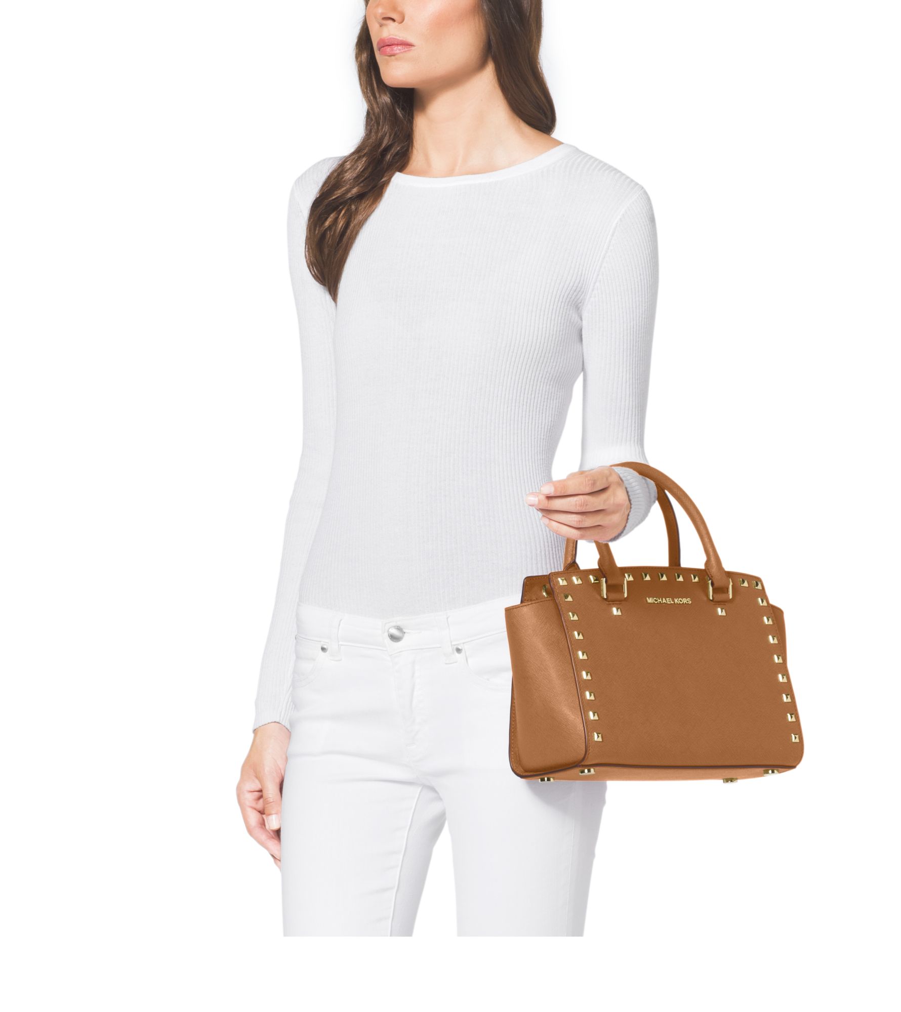 Our Selma satchel makes a case for elegant embellishment. Trimmed with high-shine studs, our much-loved must-have has an edgy advantage, while the simple, structured shape promises a sensible statement season after season.