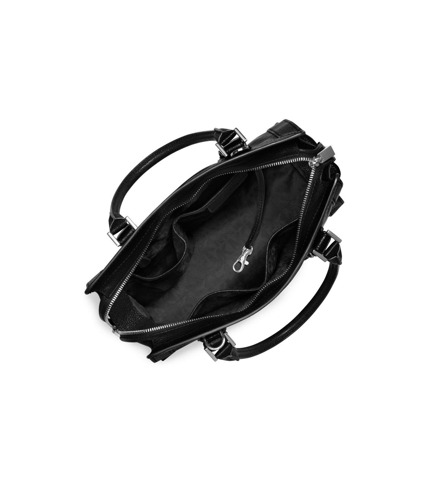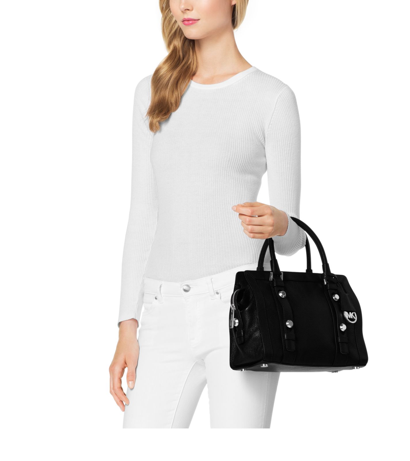 Exclusively Ours in the U.S. in Michael Kors stores and on michaelkors.com until 10/31/15. The most effortless way to reinvent your style routine is with a sumptuous handbag, and this luxe leather satchel is a perennially chic choice. Gilded hardware, like a logo charm and studs, pop against our Collins bag's rich leather craftsmanship. We especially love how this roomy design pairs with seventies-inspired ensembles like flare jeans and a white tunic.